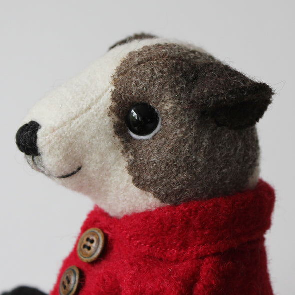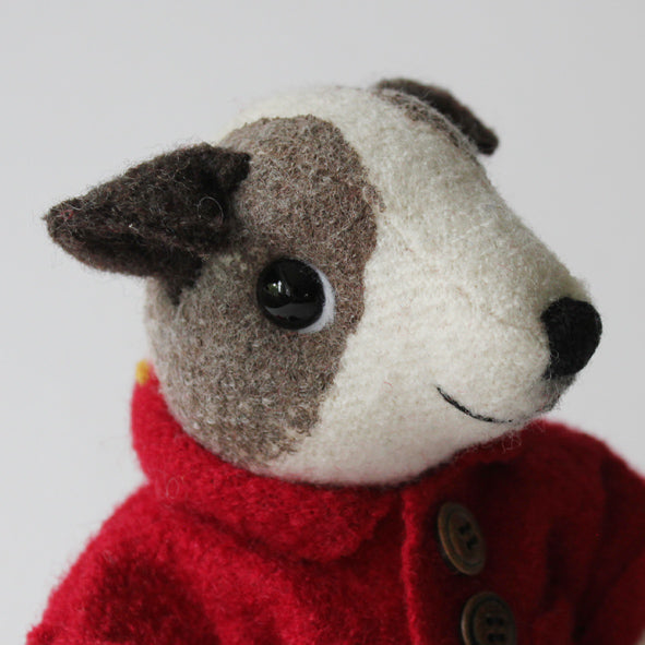 Small and cute Terrier girl made of off-white wool. Painted brown spots in her face, dark brown ears. Eyes of glass. She is dressed in a cosy wooly jacket in bright red, brown wooden buttons in front. She has armature in arms so they can be posed, jointed legs and head. Black shoes. Height 20 cm.