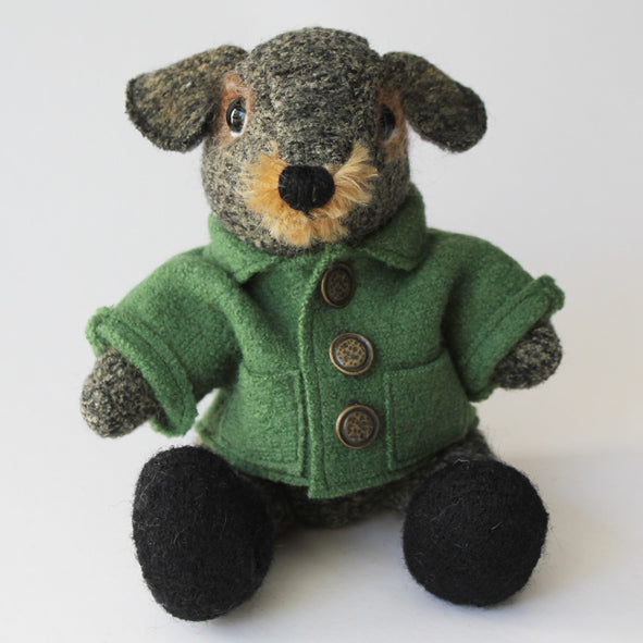 Small and chubby dachshund made of beige/black wool with whiskers in mohair and felted details on his head. He wears a forest green green jacket with brass buttons, shoes in black. His head and legs are jointed, armature in arms so they can pose. Stuffed with wool and glass pellets. Eyes made of black glass. Height 21 cm.