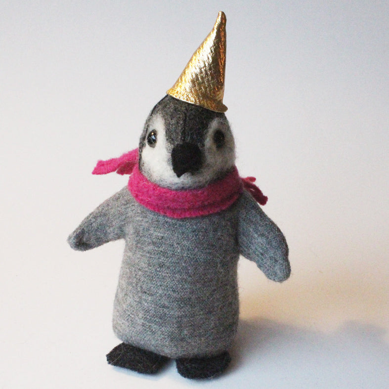 Tiny and chubby penguin girl made of grey melange woolwich felted details in her face. She wears a bright cerise wool scarf and a party hat in gold which can be taken off. She has wire in her wings so they can be posed. Grey feet and eyes of black glass. She is stuffed with wool and glass pellets. Height 16 cm without hat.